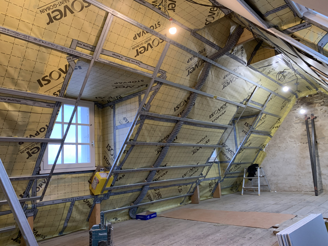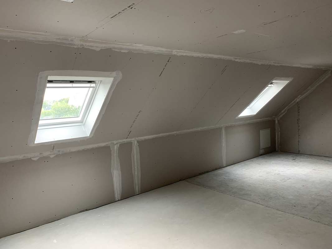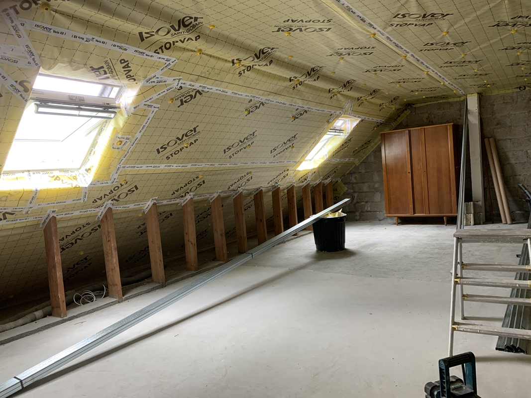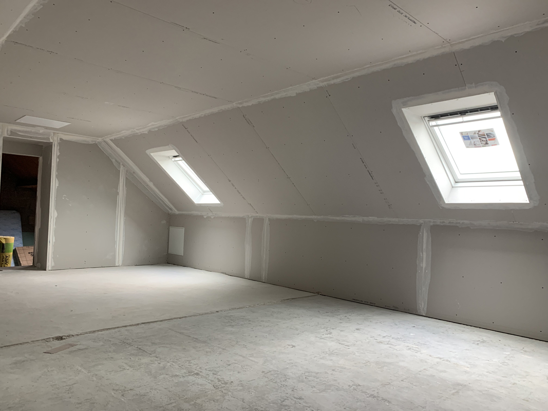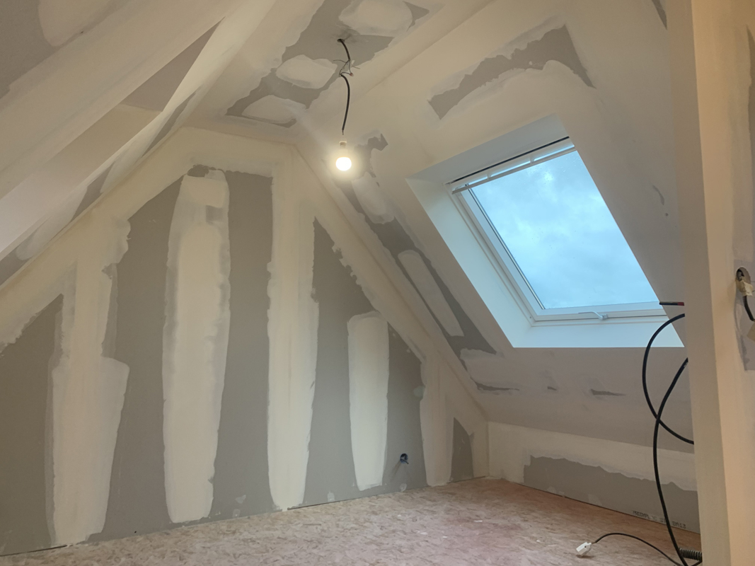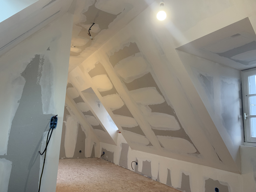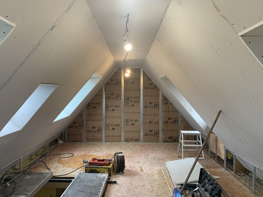 - Habillage en plaques de plâtre (BA13) : murs rampants, plafonds, pignons