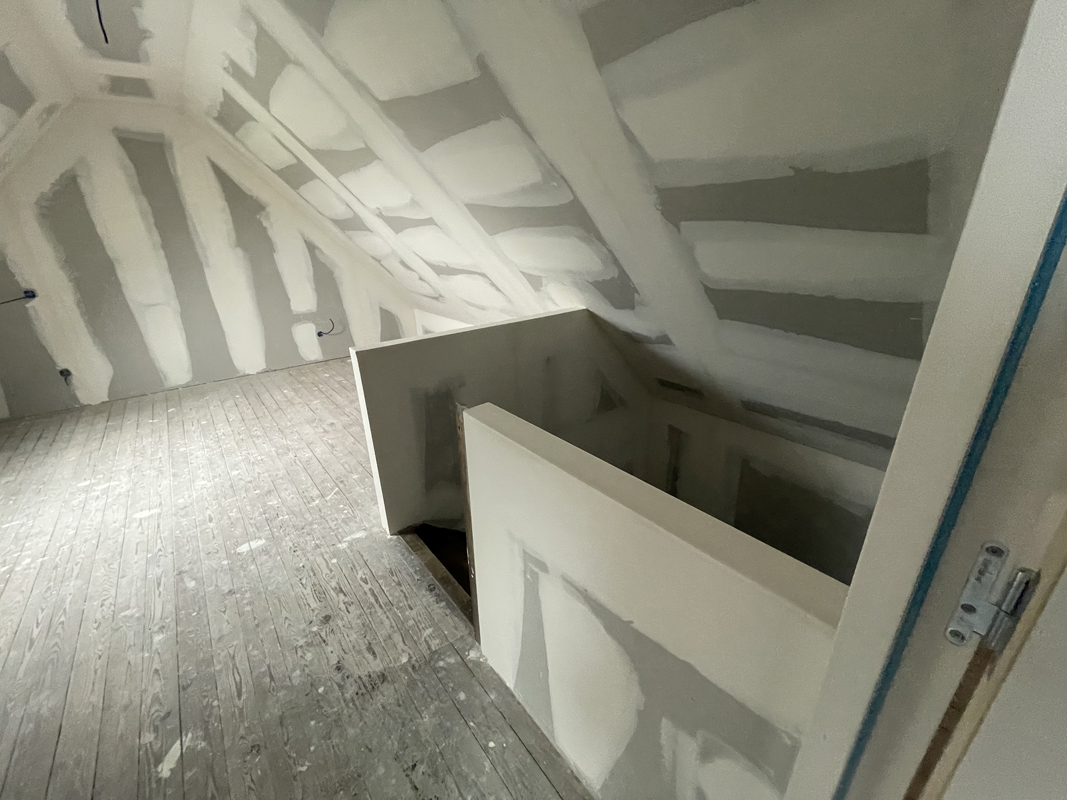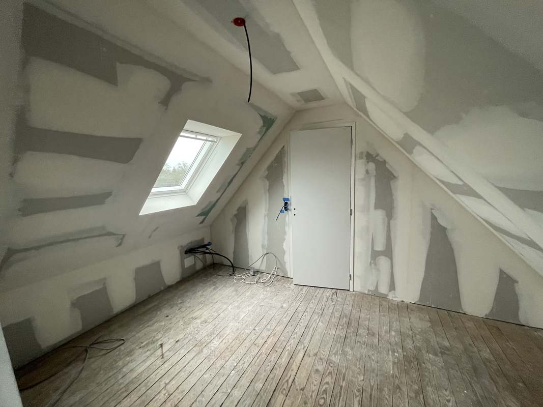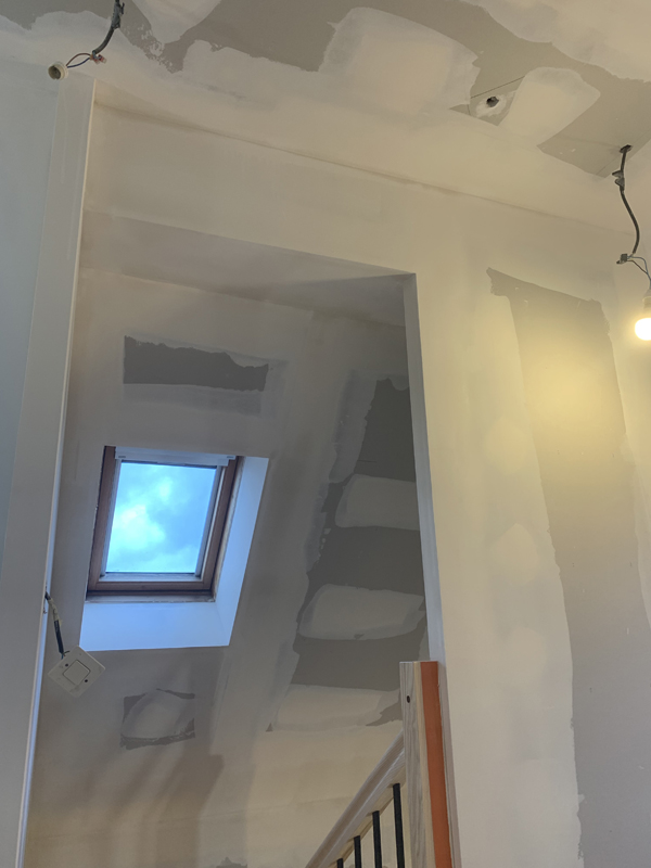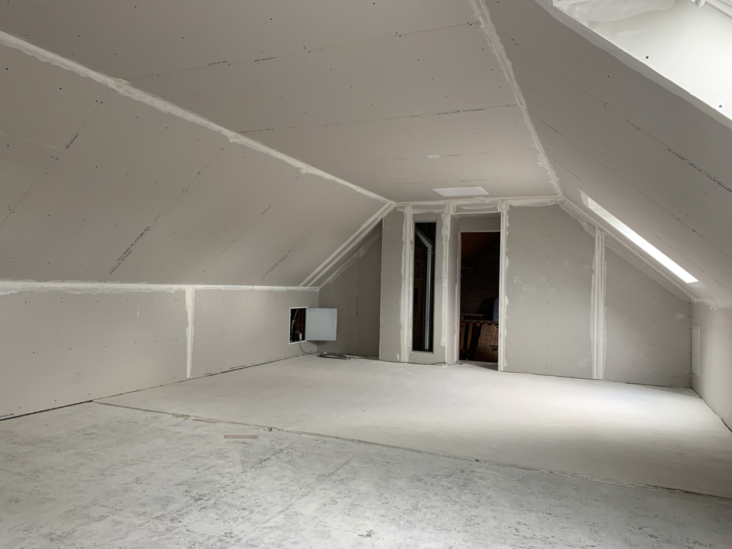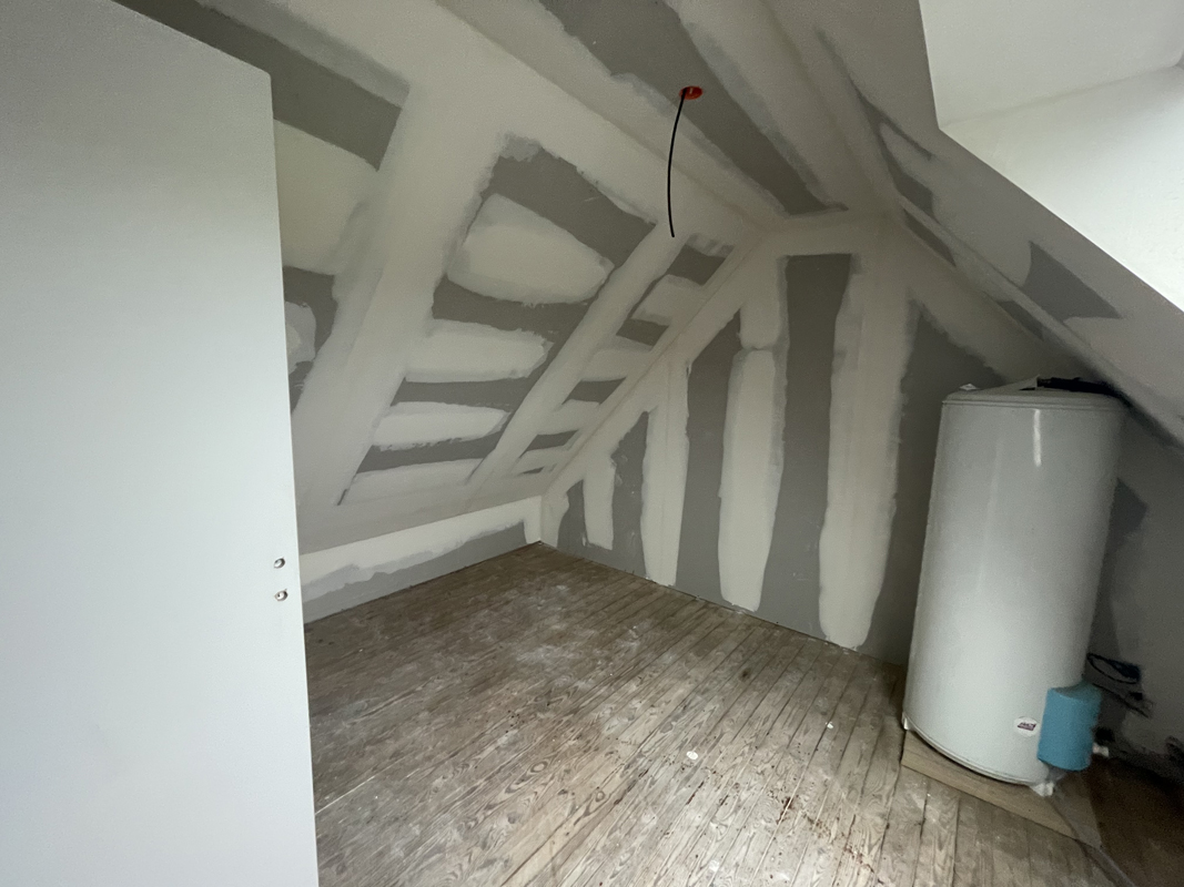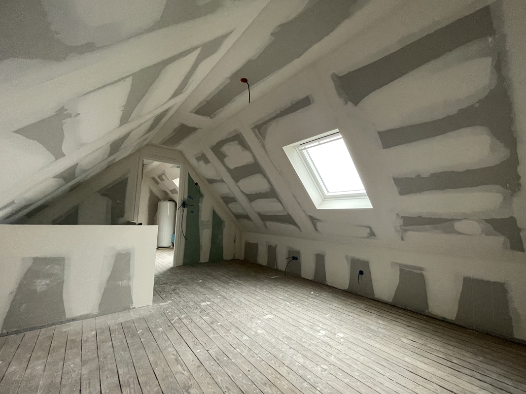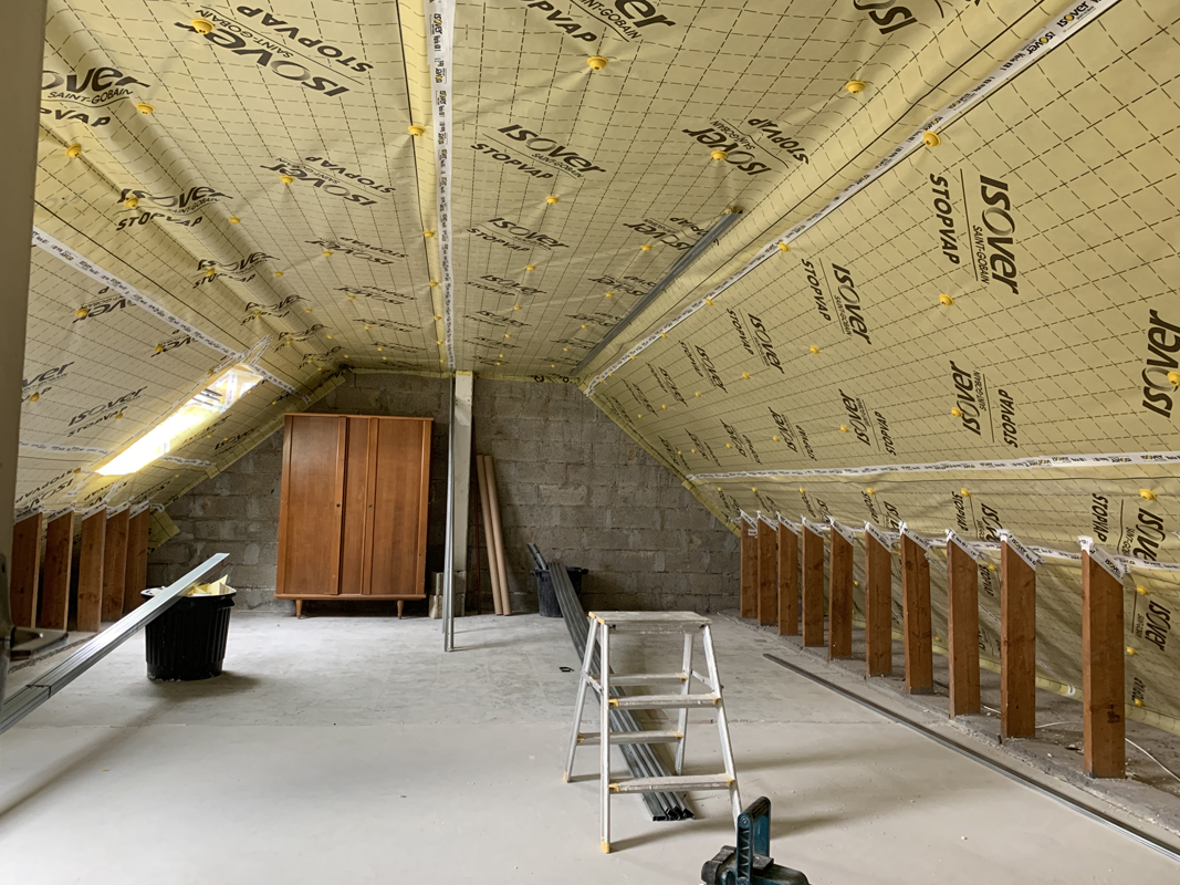 - Habillage en plaques de plâtre (BA13) : murs rampants, plafonds, pignons