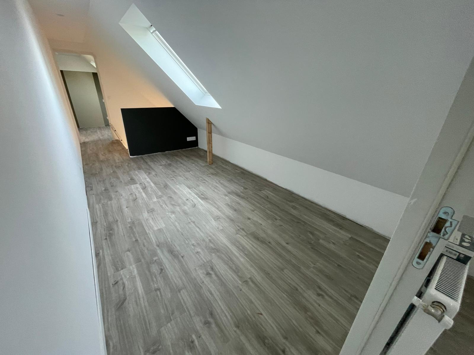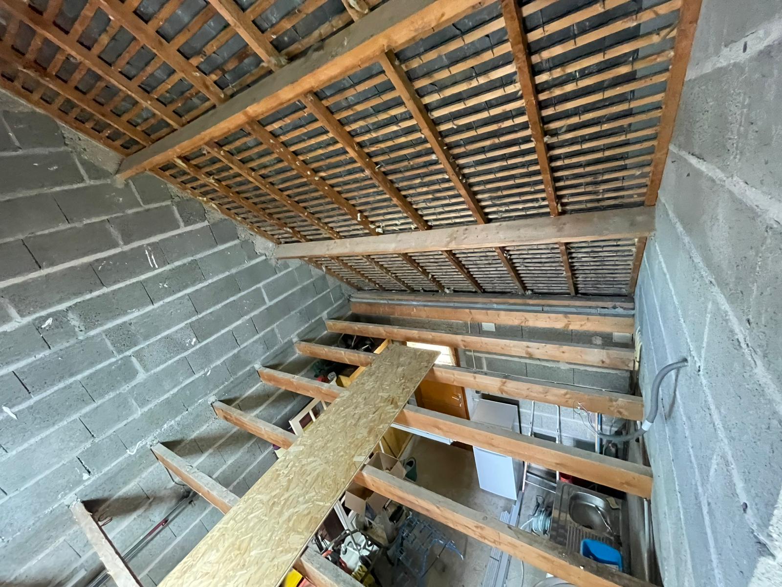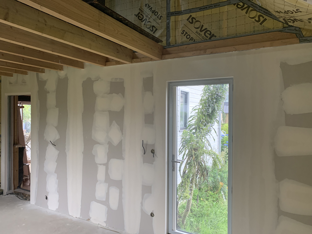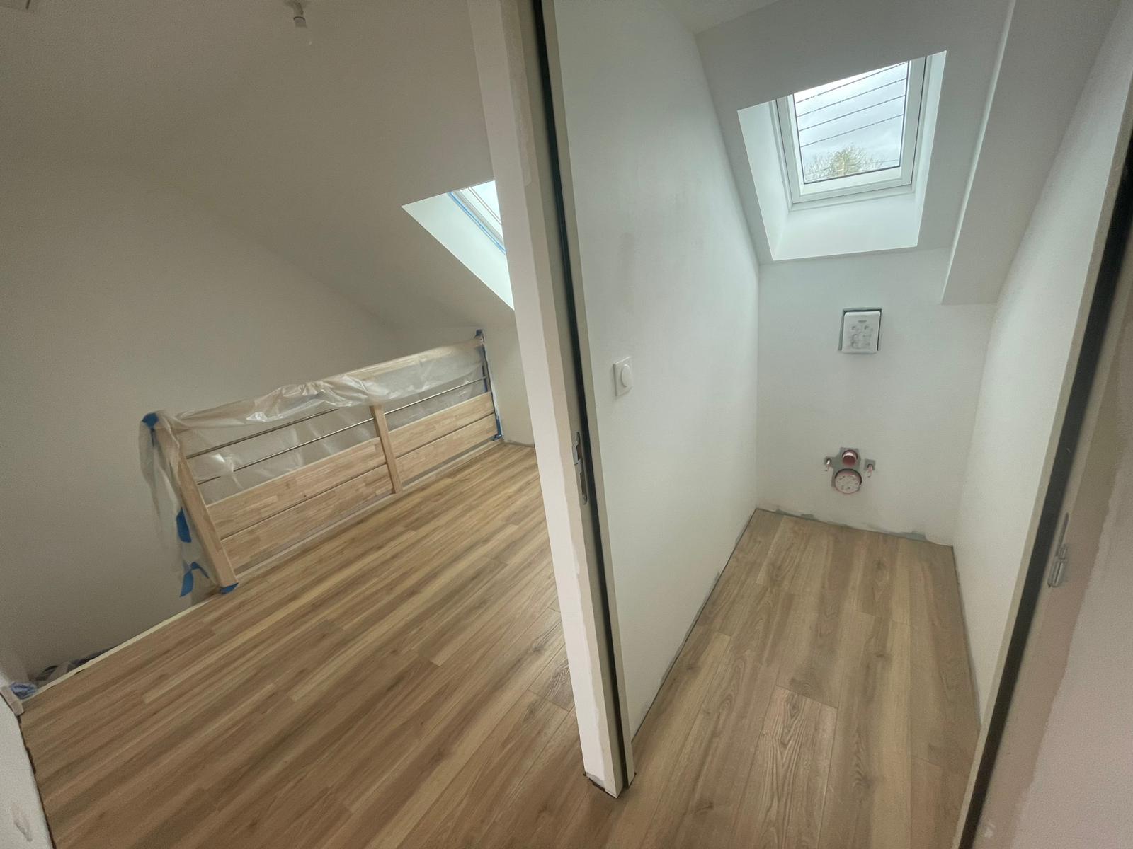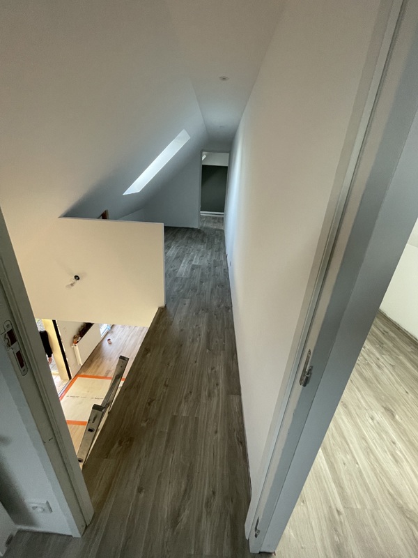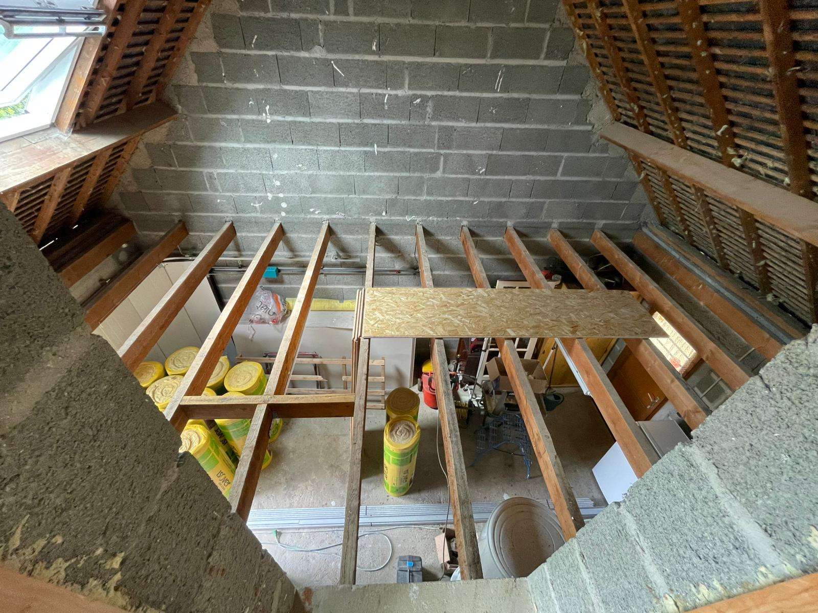 - Habillage en plaques de plâtre (BA13) : murs rampants, plafonds, pignons