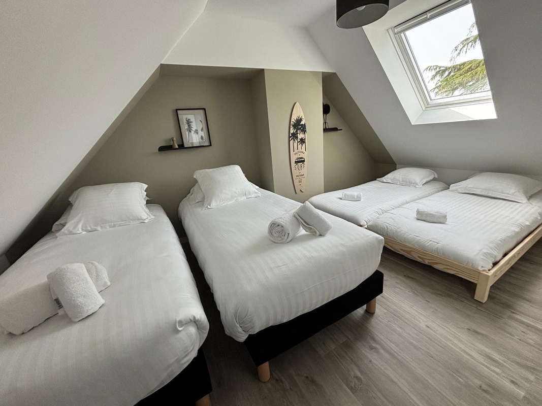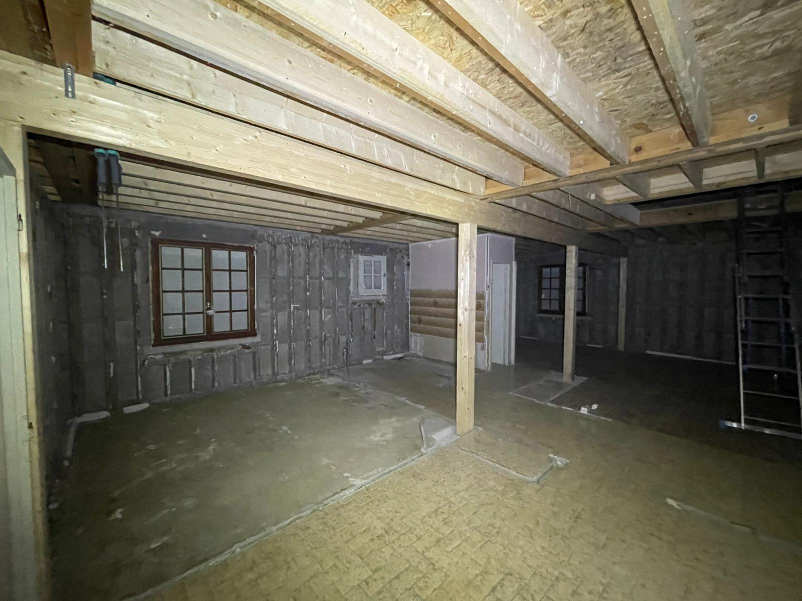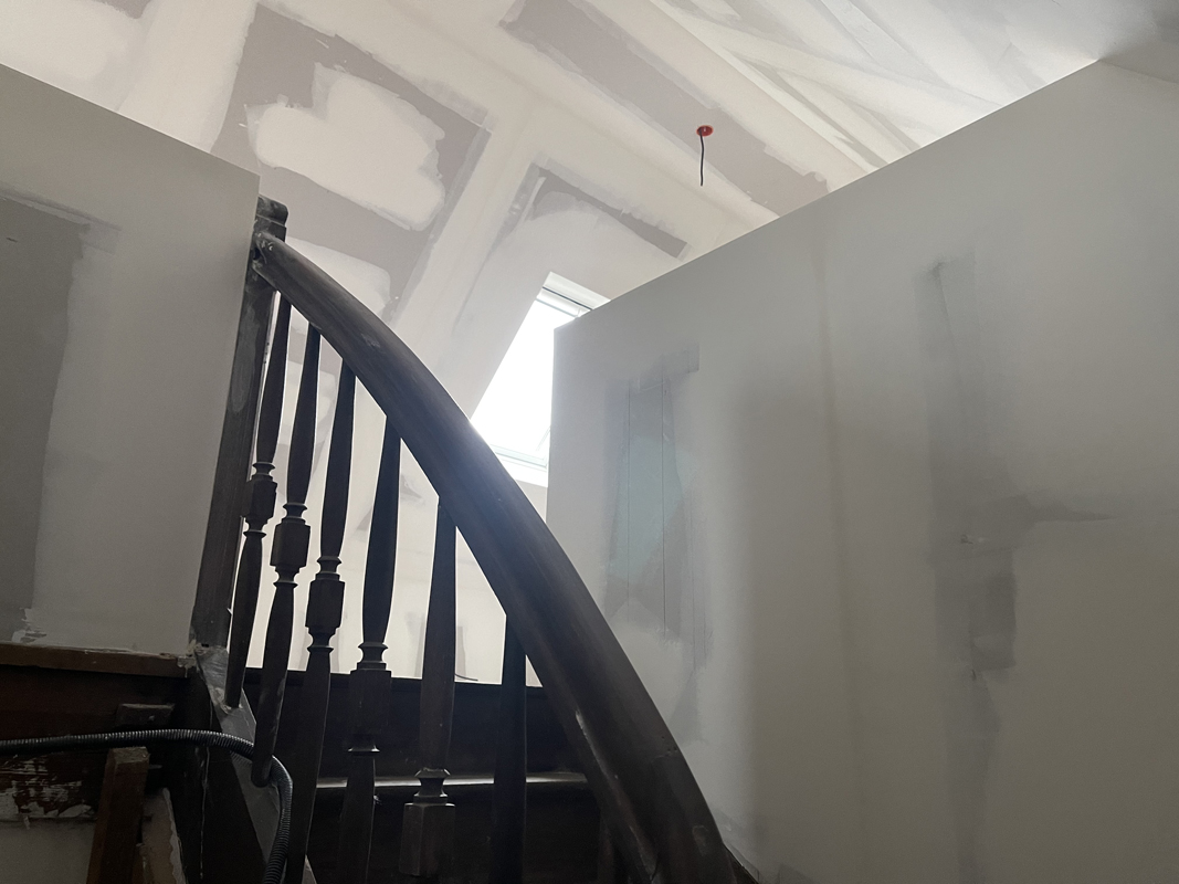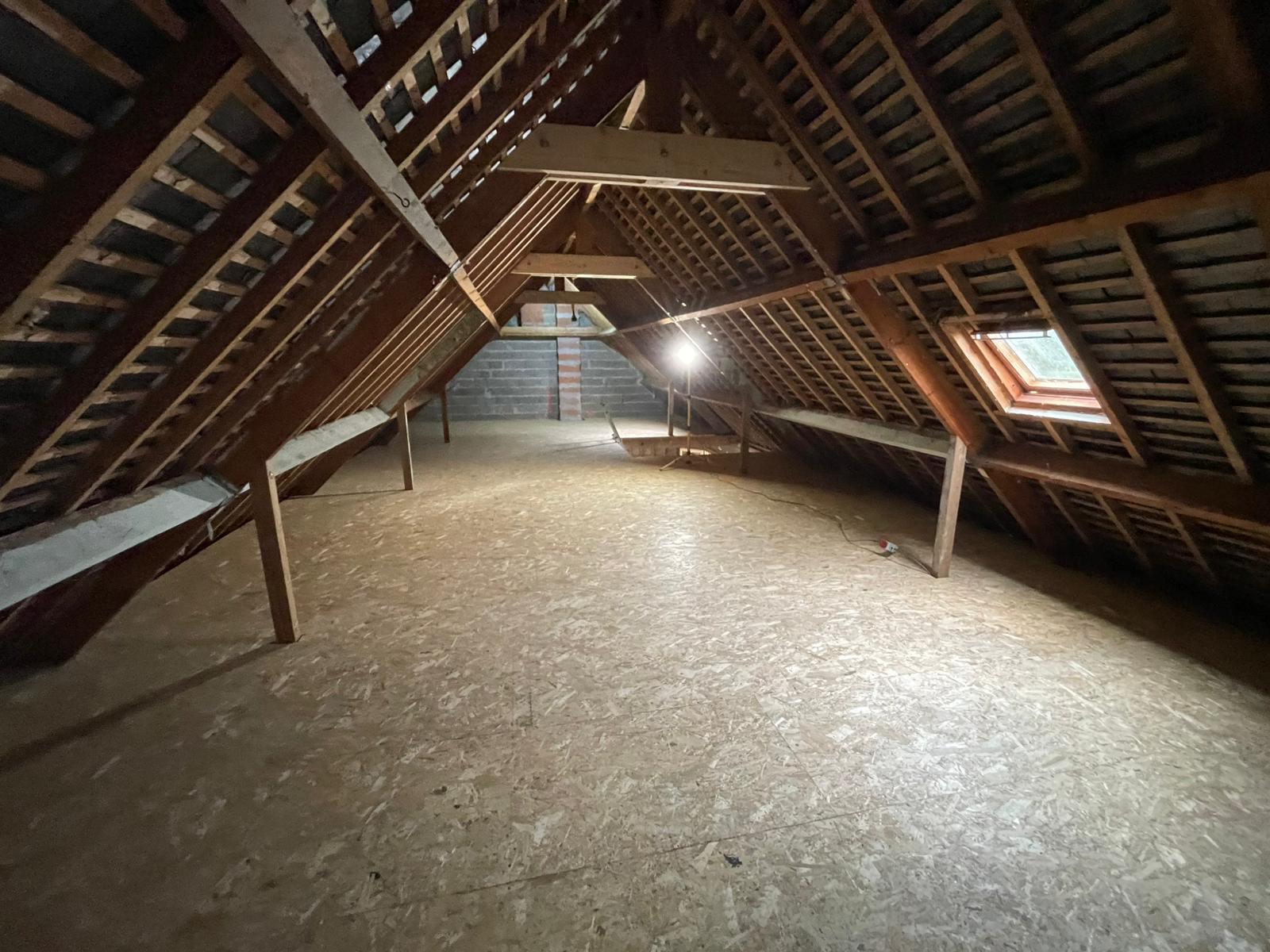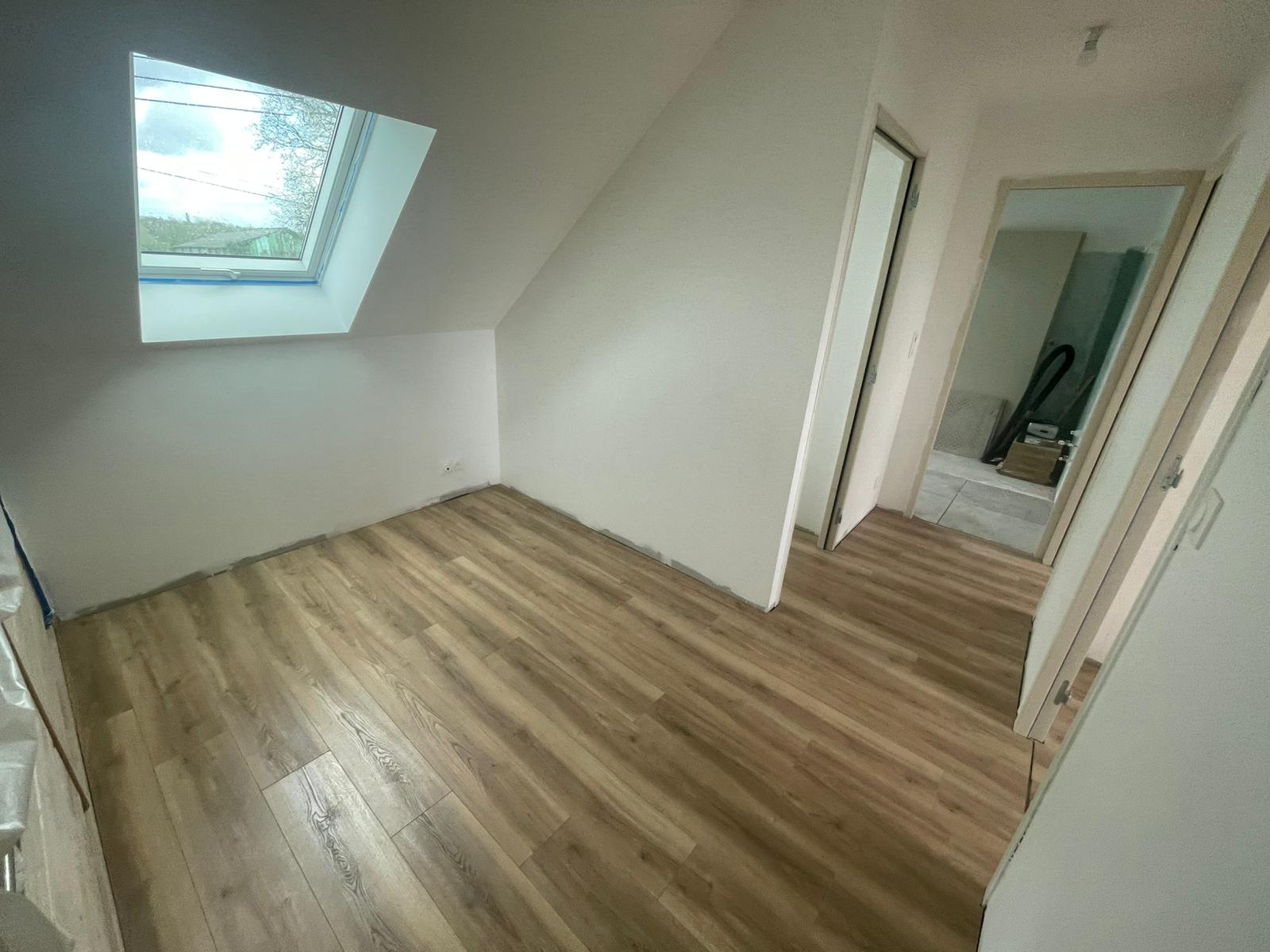 - Habillage en plaques de plâtre (BA13) : murs rampants, plafonds, pignons