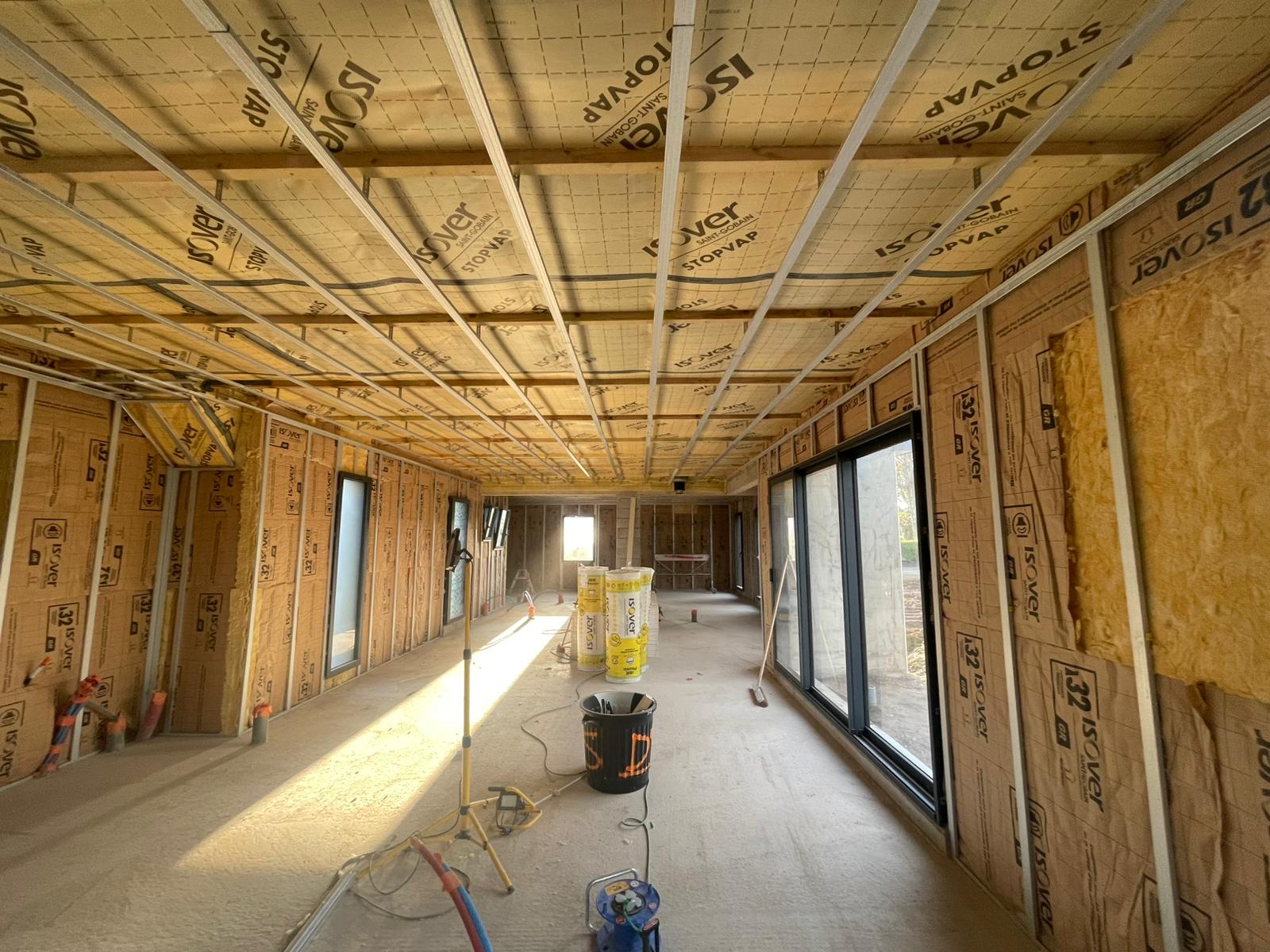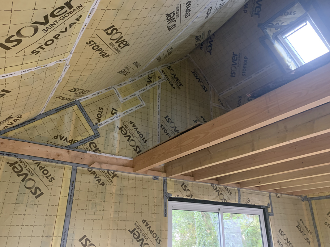 - Pose de membrane d’étanchéité à l’air pour limiter les infiltrations et améliorer la performance globale du bâti