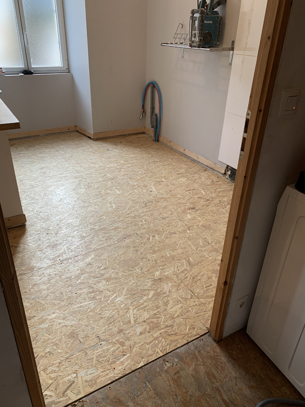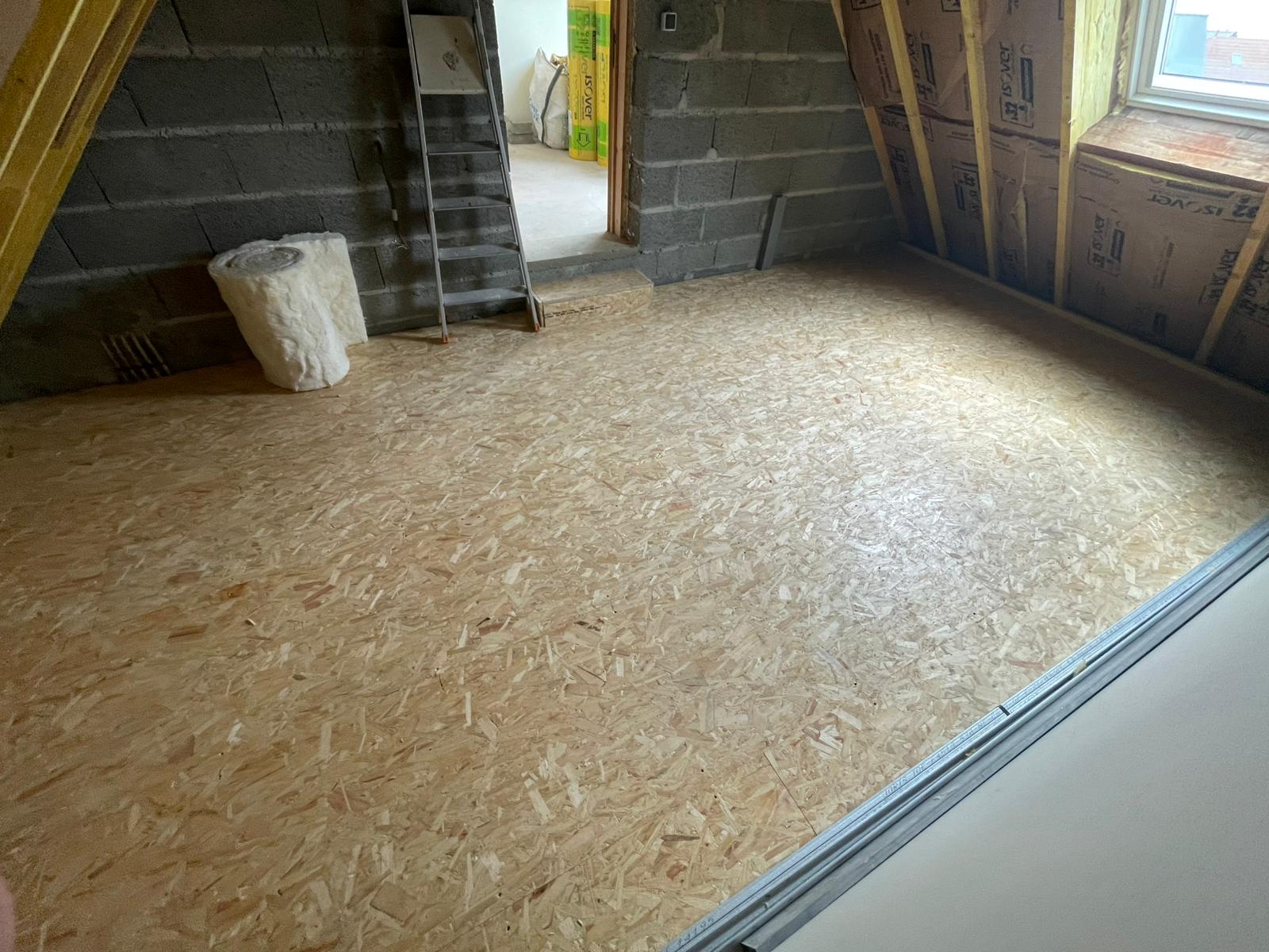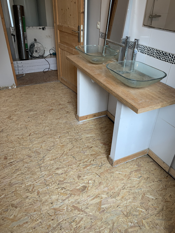 - Pose d’un plancher porteur en dalles OSB 22 mm, vissées sur la structure